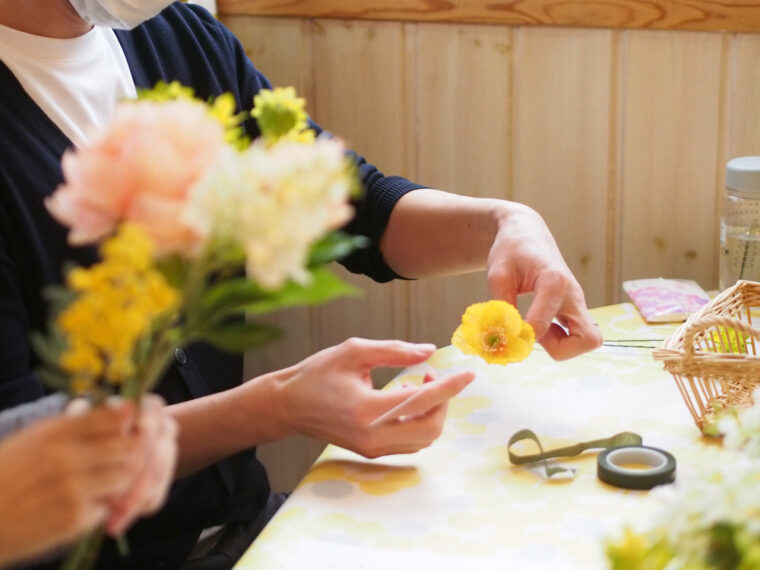 フラワーアレンジメントのご経験がないお二人でしたが、非常に手早く制作されていた姿が印象的でした。