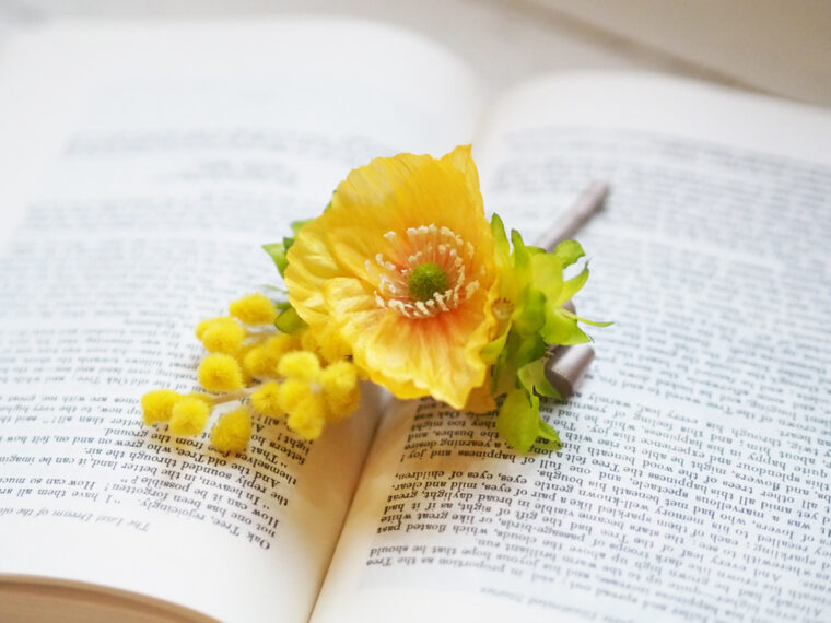 今回制作していただくのはイエロー×オレンジのオーバルブーケ&ブートニア。