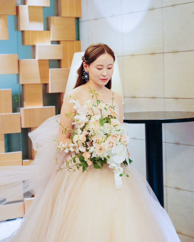 レッスン中も素晴らしい仕上がりのブーケを見ていましたが、こうして当日花嫁姿に合わせるとさらに美しく見えます。