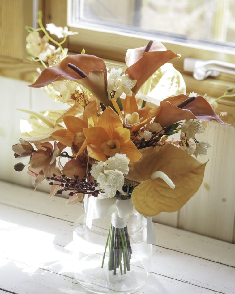 オレンジ系の花をメインにシックな雰囲気のブーケが出来上がり。