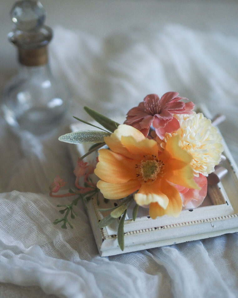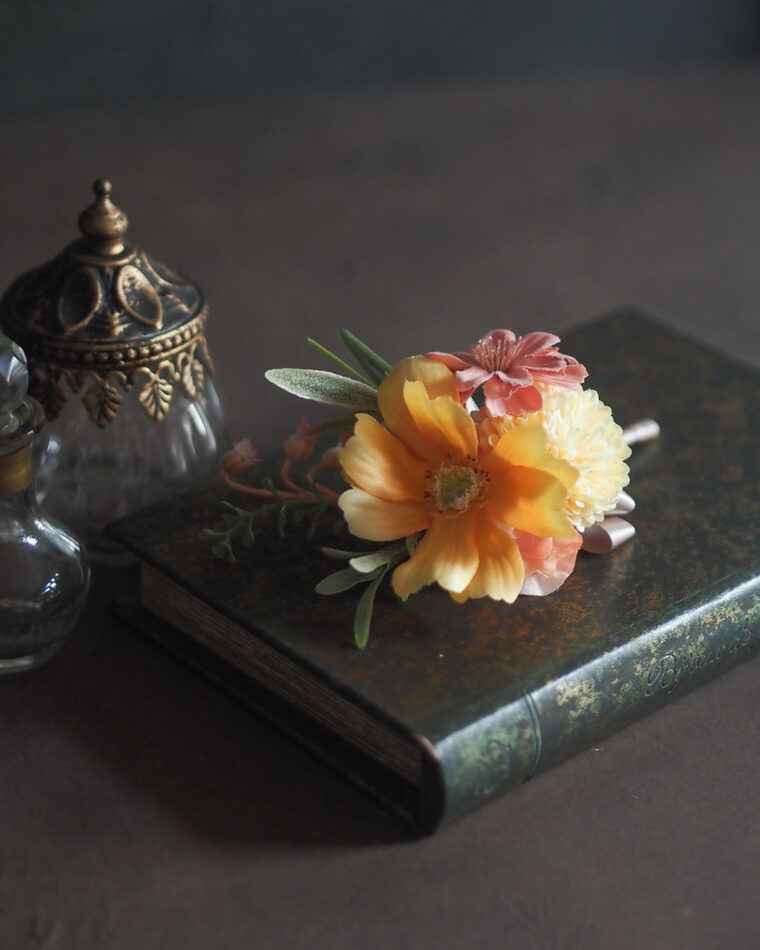 やわらかな朝日のような色合いのアーティフィシャルフラワーのウェディングブーケをオーダーメイドでお作りしました。
