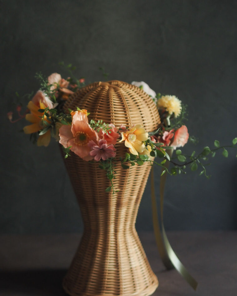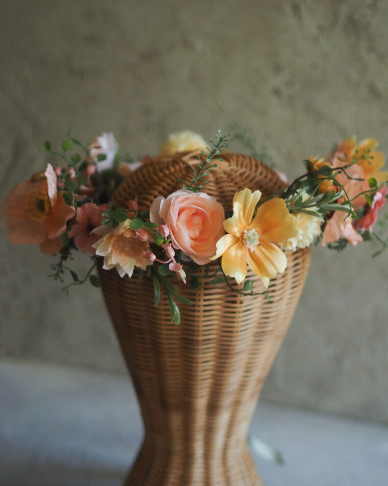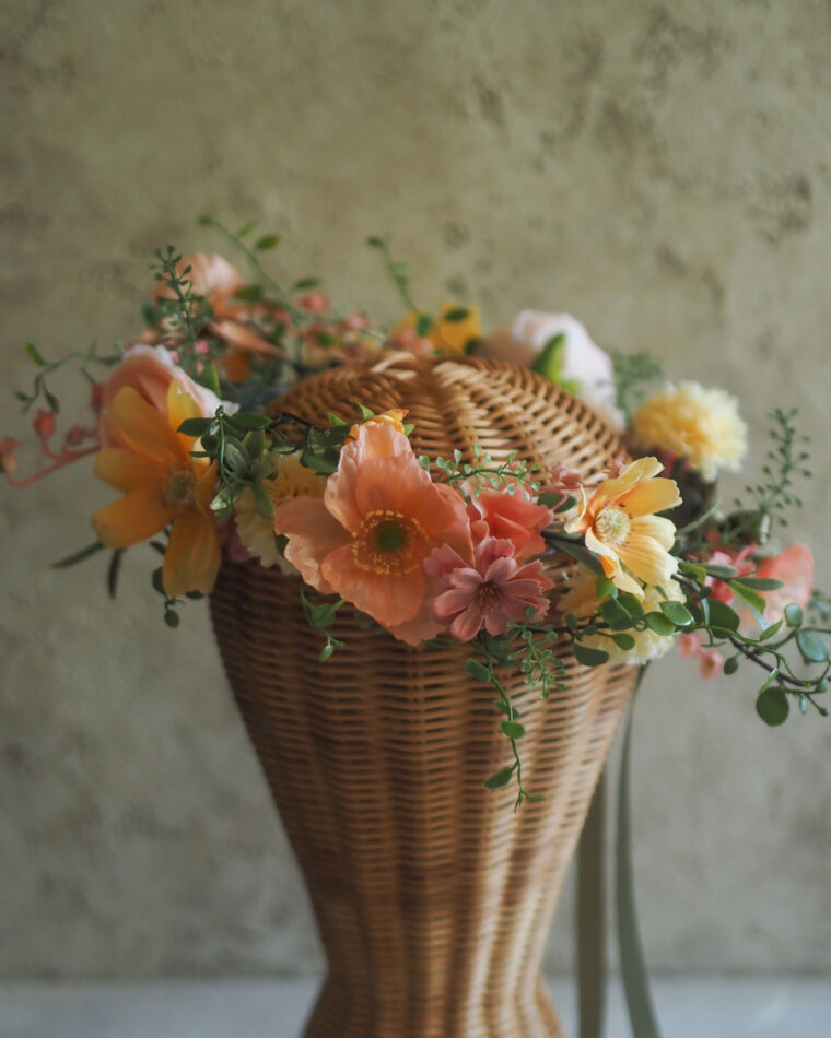 ポピーや秋桜、ラナンキュラスが重なり合い、オレンジからアプリコット、レモンイエロー、そしてピンクへと広がるグラデーション。
