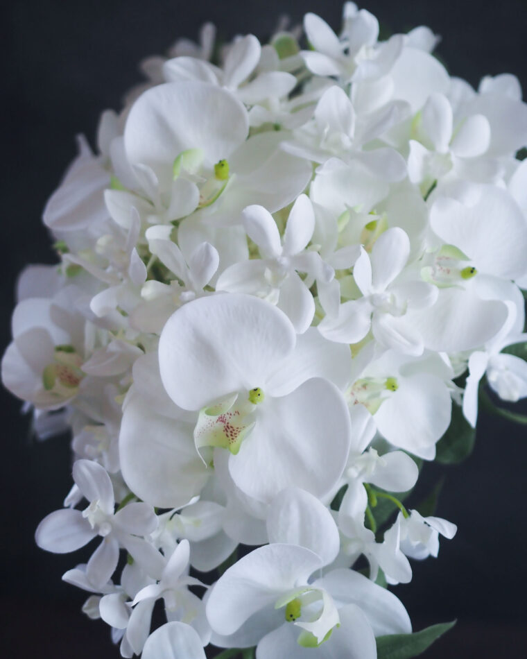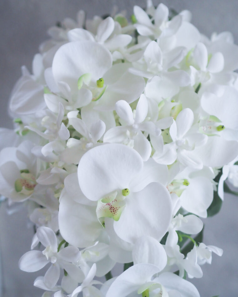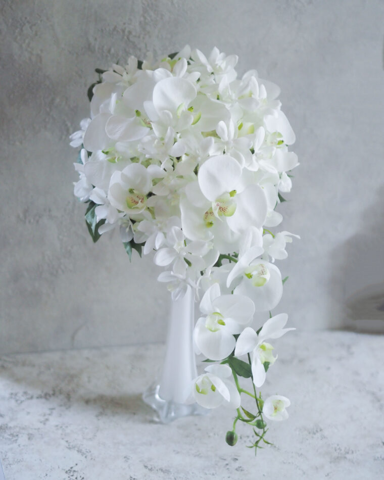 コチョウランを使った純白のキャスケードブーケ。アーティフィシャルフラワーで制作。